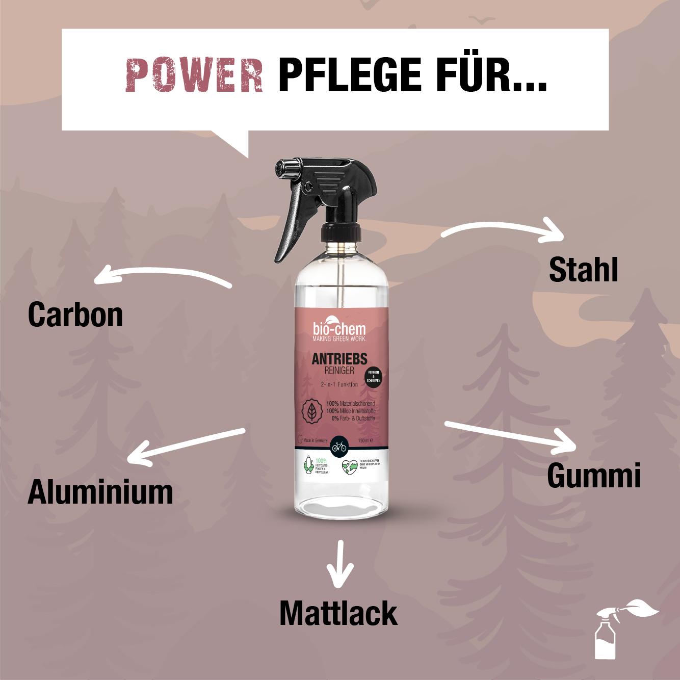Freunde des aktiven Radsports aufgepasst! Vorbei mit zeitaufwendigem und nervigem Reinigen und Schmieren der Fahrradkette! Mit dem bio-chem Antriebsreiniger reinigst und schmierst du deine Fahrradkette und das Kettenritzel in einem Schritt umweltfreundlich und effizient. Das Mittel riecht dabei nicht streng und ist natürlich kein bisschen aggressiv so wie es viele herkömmliche Kettenreiniger sind. Trotzdem ist der bio-chem Antriebsreiniger extrem wirkungsvoll und auch auf Aluminium bedenkenlos verträglich.