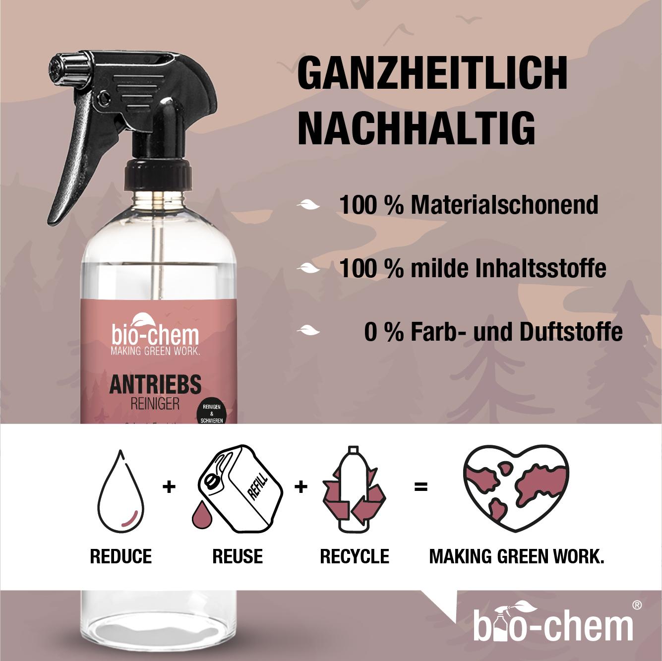 Freunde des aktiven Radsports aufgepasst! Vorbei mit zeitaufwendigem und nervigem Reinigen und Schmieren der Fahrradkette! Mit dem bio-chem Antriebsreiniger reinigst und schmierst du deine Fahrradkette und das Kettenritzel in einem Schritt umweltfreundlich und effizient. Das Mittel riecht dabei nicht streng und ist natürlich kein bisschen aggressiv so wie es viele herkömmliche Kettenreiniger sind. Trotzdem ist der bio-chem Antriebsreiniger extrem wirkungsvoll und auch auf Aluminium bedenkenlos verträglich.