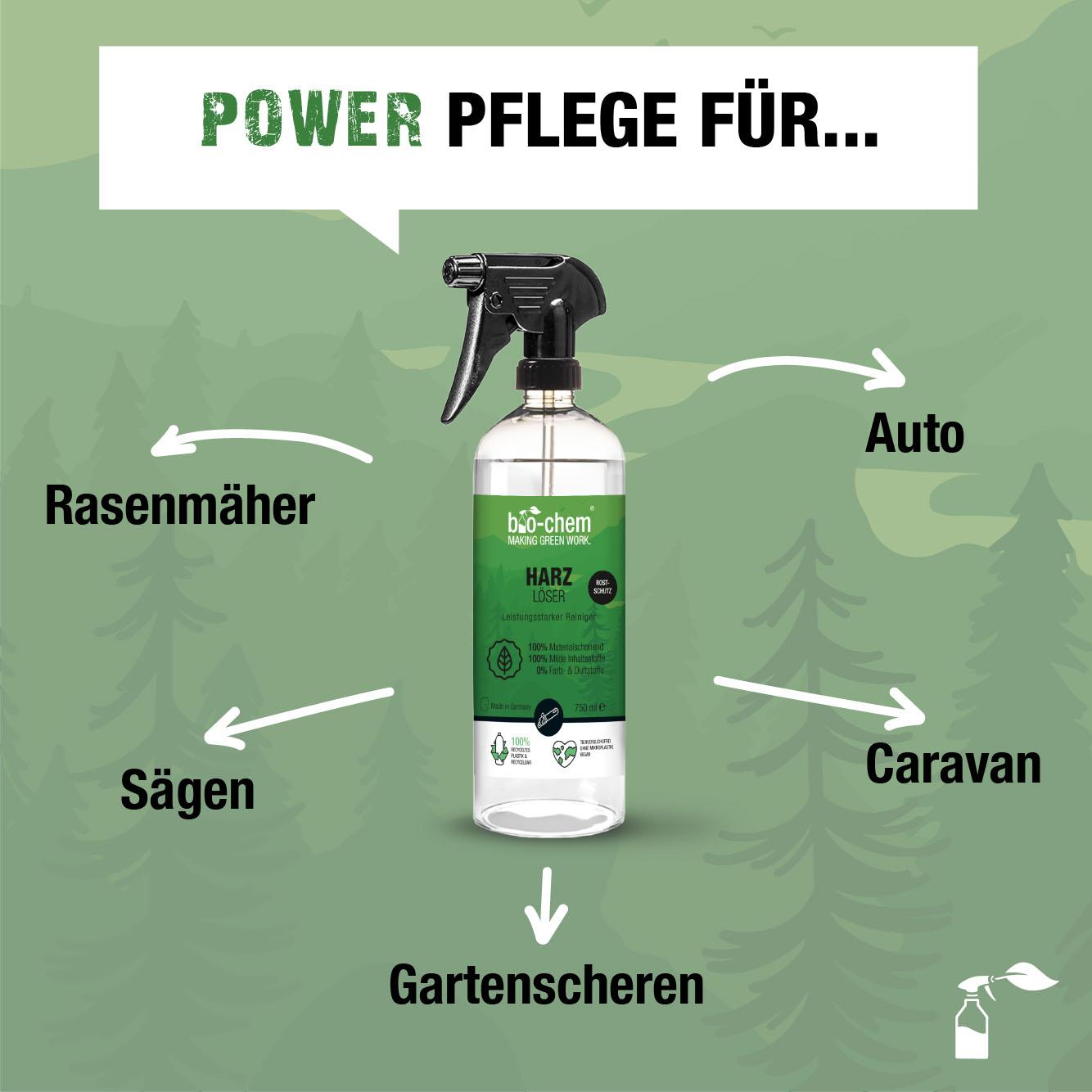 Der bio-chem Harzlöser ist ein extrem effektiver Harz-Entferner zur zügigen und schnellen Reinigung von Natur- und Kunstharz. Durch die milden und zugleich kraftvollen Inhaltsstoffe eignet sich das Mittel wunderbar für hochwertige Gartengeräte- und maschinen - sowohl elektronisch als auch mechanisch. Auch Dein Caravan oder Auto kannst du mit dem Harzlöser bequem von hartnäckigen Harzrückständen befreien. Und das alles natürlich ohne ätzenden Duft oder Sprühnebel, wie bei vielen herkömmlichen Produkten.