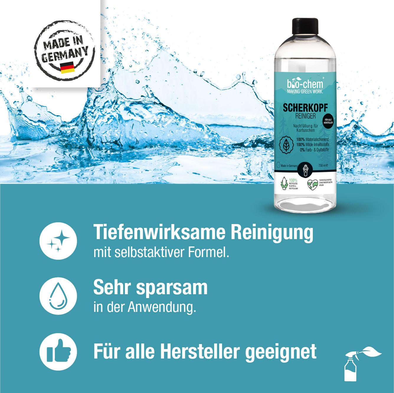 Der Scherkopfreiniger von bio-chem ist die perfekte Lösung, wenn Du zukünftig auf den Kauf teurer Reinigungskartuschen für Deinen Rasierer verzichten möchtest. Ist es Dir nicht auch ein Dorn im Auge immer eine Kartusche mit gebrauchter Flüssigkeit wegzuschmeissen? Selten ist es so einfach Geld und unnötigen Plastikmüll zu sparen. Nutze den bio-chem Scherkopfreiniger für ein hervorragendes und materialschonendes Reinigungsergebnis. Einfach die gebrauchte Kartusche ausspülen und mit frischer Flüssigkeit auffüllen. Schon kann es mit der Reinigung losgehen.