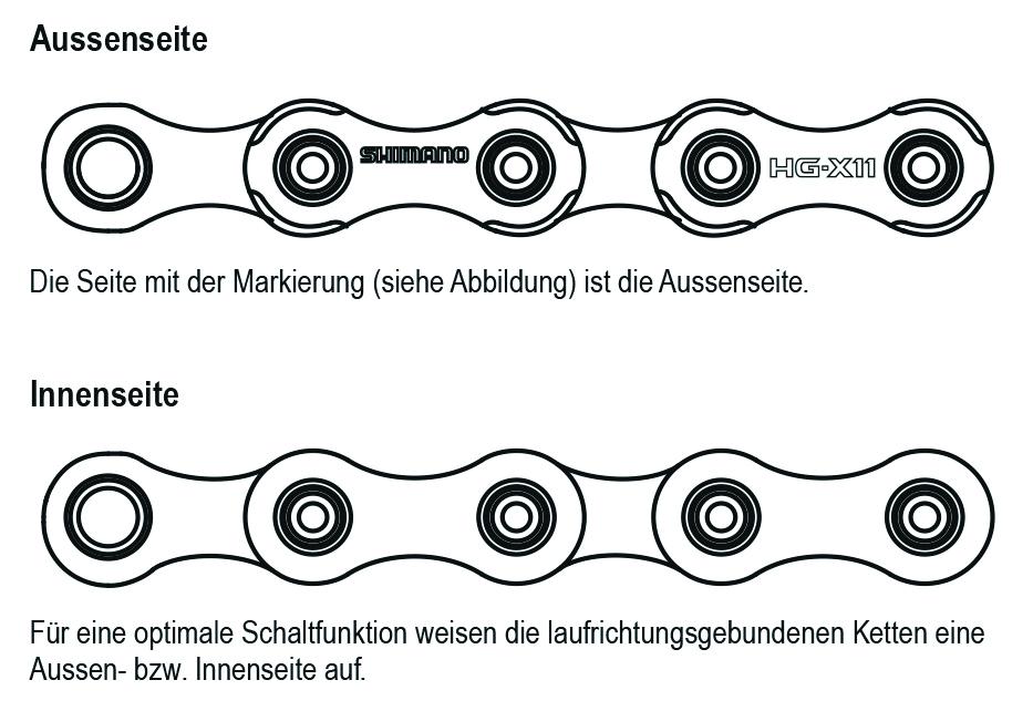 Das Design der neu entwickelten HG-X 11-fach-Ketten sorgt für noch geschmeidigere Gangwechsel und verbessert die Gesamtleistung des Antriebsstrangs. Die Laufrichtung der Ketten ist vorgegeben (Directional Chain), denn die linke Seite ist für Gangwechsel vorne und die rechte für Gangwechsel hinten optimiert.