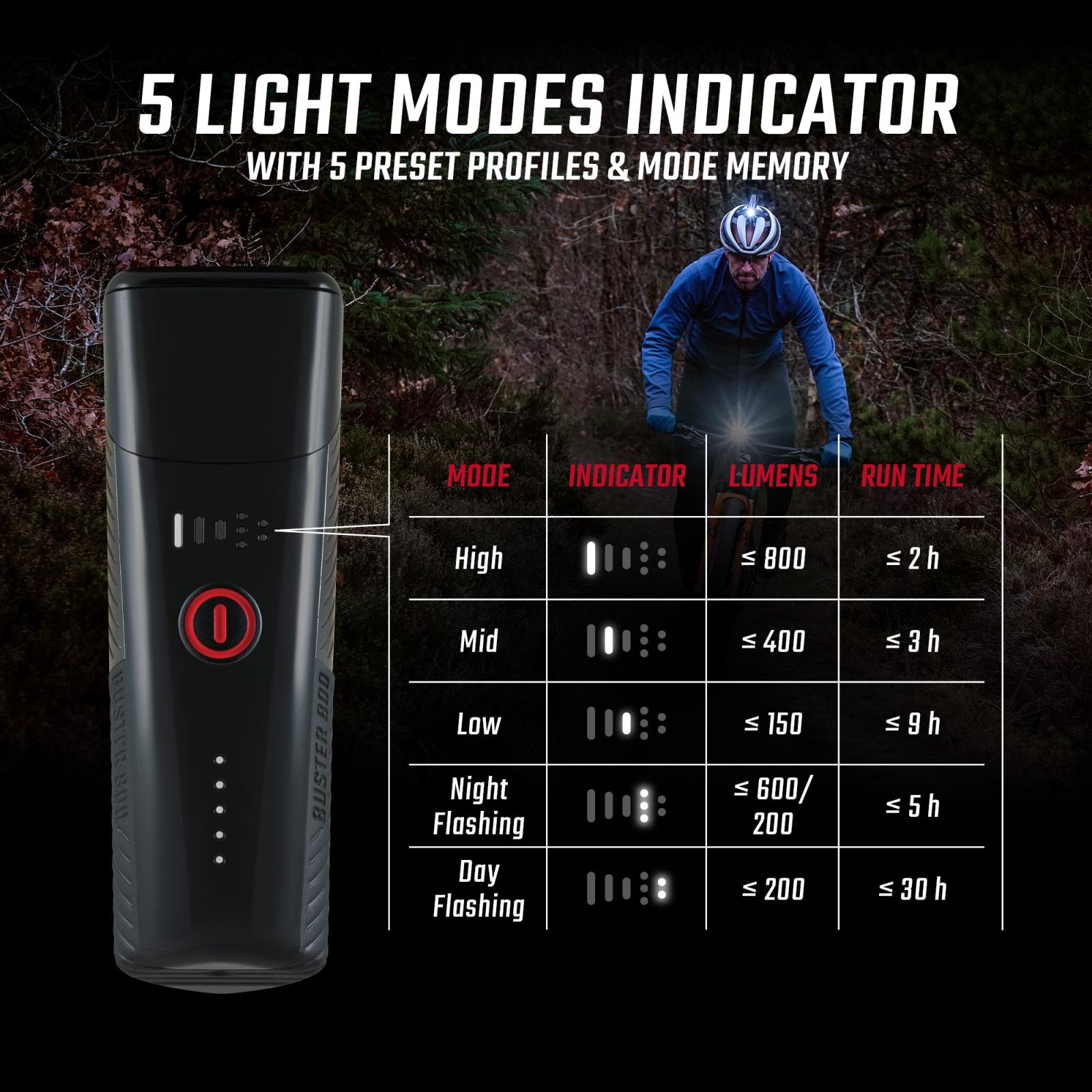 Das Beleuchtungsset, bestehend aus der Frontleuchte BUSTER 800 und der neuen leistungsstarken Rückleuchte RL 150, sorgen für eine optimale Ausleuchtung der Wege, selbst im dunklen Wald