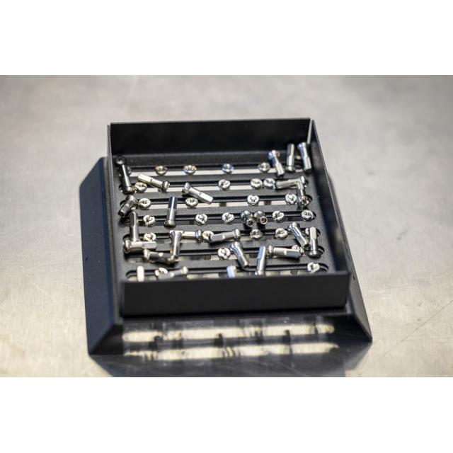 Der Speichennippel-Shuffler ist die ultimative Lösung, um den Radbauprozess zu rationalisieren. Legen Sie Ihre Speichennippel einfach in den Speichennippel-Shuffler und schütteln Sie ihn leicht. Im Handumdrehen sind die Speichennippel perfekt geordnet und bereit für die einfache Entnahme mit unserem speziellen Nippel-Einführwerkzeug. Unser Speichen-Nippel-Shuffler wurde entwickelt, um die Handhabung von Speichennippeln zu vereinfachen und den Laufradbau schneller und effizienter als je zuvor zu machen. Dank der einstellbaren Rasterpositionierung ist unser Speichennippel-Shuffler mit einer breiten Palette von Speichennippelgrößen kompatibel und bietet so Vielseitigkeit und Komfort für Laufradbauer aller Art.