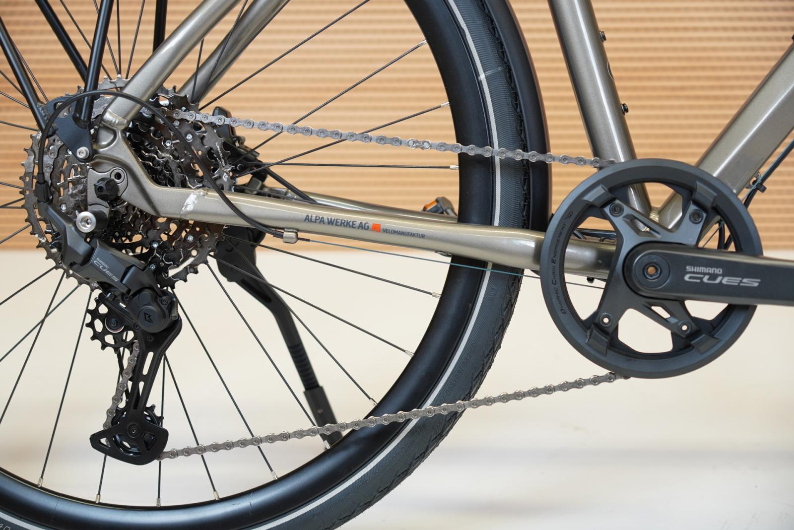 Leicht, stabil und komfortabel fährt sich das Cresta Veloce – sowohl auf Asphalt als auch auf Schotterpisten oder Waldwegen. Der relativ kurze Vorbau vermittelt ein direktes Gefühl für die Fahrbahn. Der hochwertige Alurahmen ist sehr stabil. Verschliffene Schweissnähte sorgen für eine cleane Optik. Die moderate Sitzposition ist auch für längere Touren gut geeignet. Die breiten Schwalbe Marathon Reifen bieten einen hohen Pannenschutz und bügeln gemeinsam mit der Federgabel Unebenheiten effektiv weg. Hydraulische Scheibenbremsen bringen das Cresta Veloce fein dosierbar und sicher zum Stehen. Am Systemgepäckträger können Packtaschen, Fahrradkorb oder Topcase bequem mit einem Klick eingehängt und wieder gelöst werden. Serienmässig wird das Cresta Veloce mit der soliden Shimano Cues Kettenschaltung mit 10 Gängen ausgestattet. Der moderne Busch & Müller LED Scheinwerfer leuchtet die Fahrbahn im Dunkeln hell und gleichmässig aus. Die Standlichtfunktion sorgt auch für gute Sichtbarkeit, wenn das Velo nicht bewegt wird.