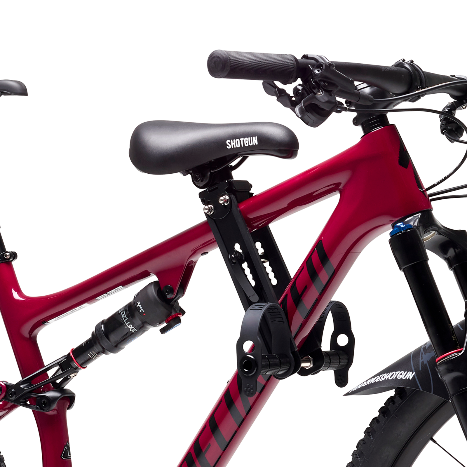 Vorn montierter Kindersitz für MTBs für Kinder von 2-5 Jahren bis zu 22 kg. Vollgummischutz (für Rahmen aus Aluminium oder Carbon). Einstellbare Breite und Winkel für alle Mountainbikes. E-MTB kompatibel je nach Unterrohrbreite. Schnellkupplung für einfache Montage und Demontage.